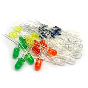 Contains 5 Diffused Reds, 5 Diffused Yellows, 5 Diffused Greens, 5 Clear Blues and Clear Whites. These light-emitting diodes work well for a wide variety of applications. Comes with some resistors for connection. Forward Voltages are Red 1.9-2.0V, Yellow ; Green 2.0-2.1V, Clear Blue and Clear White: 3.0-3.2V. Packaged in a resealable zip lock bag for your ease of use.